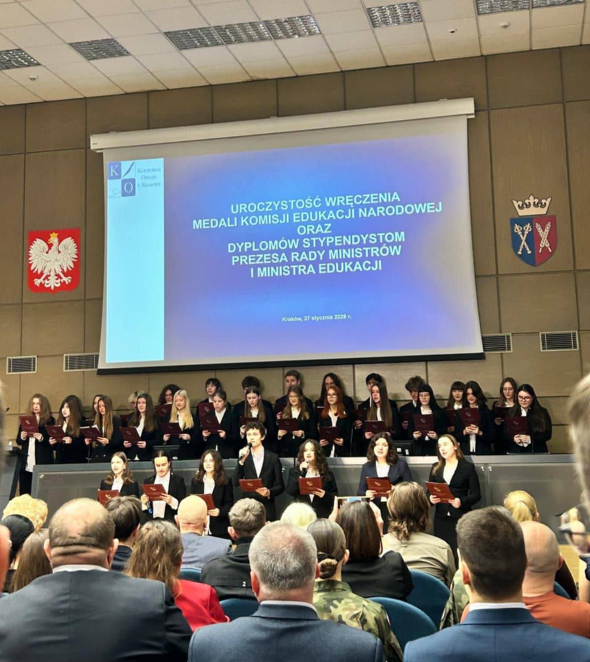 Weronika Perzanowska z klasy 3a na uroczystej gali wręczenia dyplomów stypendystom Prezesa Rady Ministrów i Ministra Edukacji.