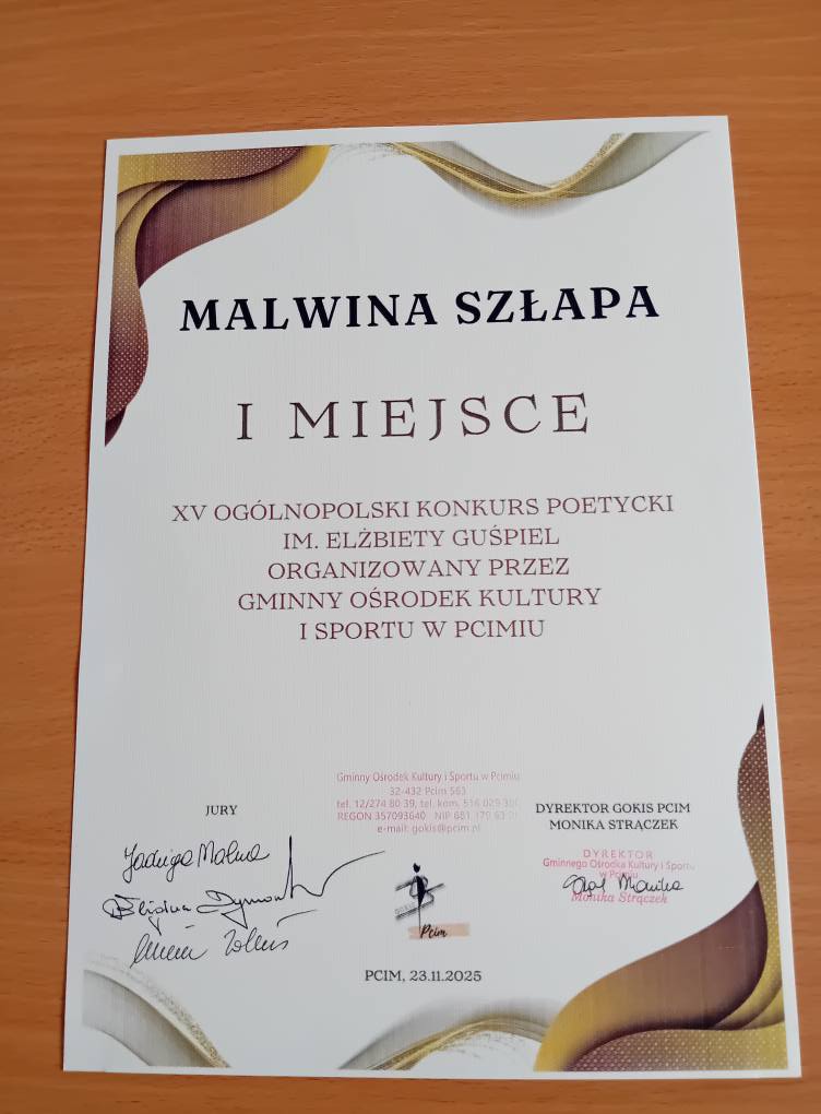 Z wielką dumą informujemy, że Malwina Szłapa - uczennica klasy 4c zajęła PIERWSZE MIEJSCE w XV Ogólnopolskim Konkursie Poetyckim im. Elżbiety Guśpiel organizowanym przez Gminny Ośrodek Kultury i Sportu w Pcimiu.