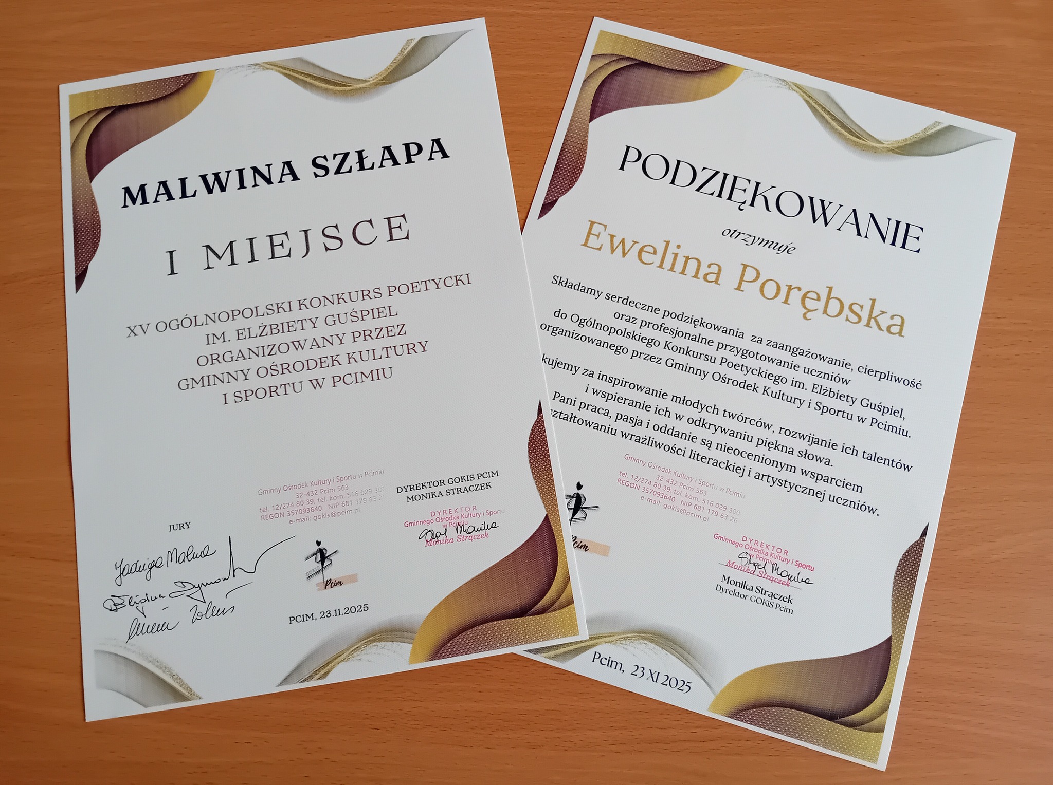 Z wielką dumą informujemy, że Malwina Szłapa - uczennica klasy 4c zajęła PIERWSZE MIEJSCE w XV Ogólnopolskim Konkursie Poetyckim im. Elżbiety Guśpiel organizowanym przez Gminny Ośrodek Kultury i Sportu w Pcimiu.